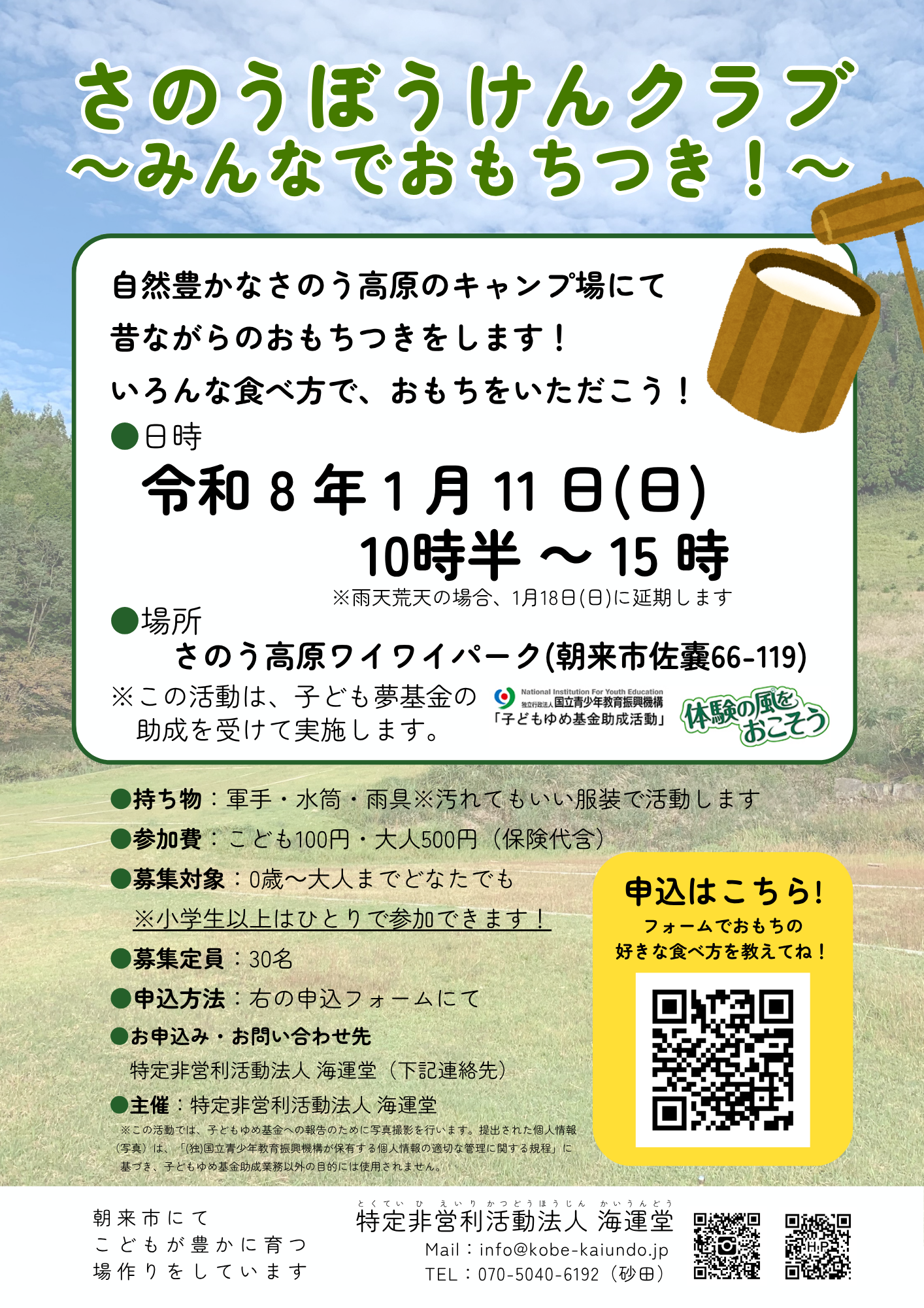 ※雨天荒天で延期する場合、申込みされた方にご連絡いたします